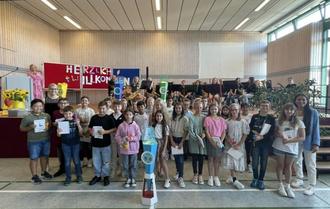 Die Fünftklässler verließen mit ihrer persönlichen Einschulungstüte und dem aktuellen IGS-Schuljahresplaner die Raiffeisenhalle zum gemeinsamen Foto. Im Anschluss starteten alle vier Klassen in die abwechslungsreich gestaltete Einführungsphase.