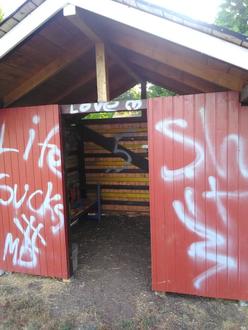 Besonders ärgerlich ist, dass die Unterstell- und Spielhütte von Helfern aus dem Ort und dem Gemeinderat ehrenamtlich und mit Engagement renoviert worden war.