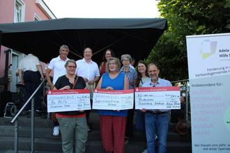 Vertreter der Adele-Pleines-Stiftung überreichten symbolische Schecks an drei Empfänger (vorne, von links): Anke Bender von der Ev. Kita und Juliane Heupel vom Ev. Jugendzentrum Hamm (Sieg) sowie Volker Hasselbach von der Grundschule Etzbach.