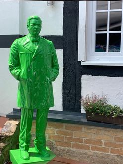 Die farbenfrohen Raiffeisenfiguren - hier vor dem Wirtshaus Zum Raiffeisen in Hamm (Sieg) sind ein Markenzeichen des Rundwanderwegs.