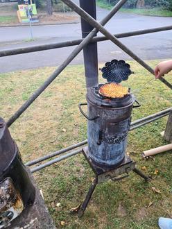 Am frühen Sonntagmorgen musste dann der Spießbratengrill bereits vorgeheizt werden, damit pünktlich zum Glockenschlag um 12.00 Uhr das Fleisch zu den begehrten Bratkartoffeln gereicht werden konnte. Auch über die Lande bekannt, sind die Kartoffelwaffeln, die in mit Holz gefeuerten, Waffeleisen gebacken werden.