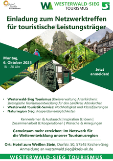 Unter dem Motto „Gemeinsam mehr erreichen - im Netzwerk für die Weiterentwicklung unserer Tourismusregion“ bietet das Treffen Gelegenheit, Kontakte zu knüpfen, Synergien zu entdecken und gemeinsam an einer erfolgreichen Zukunft des Tourismus in der Region Westerwald-Sieg zu arbeiten.