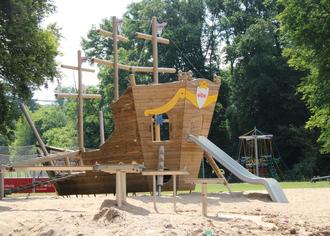 Nachdem das neue Piratenschiff letztes Jahr auf dem Abenteuerspielplatz des Waldschwimmbads eingeweiht wurde, segelt es nun erstmalig durch alle Jahreszeiten: Damit das möglich ist, hat die Verbandsgemeinde Hamm (Sieg) eine mobile Zaunanlage angeschafft, mit der sich der Spielplatz (inklusive des Beachvolleyballplatzes, Kletteranlage und Soccerfeld) – entsprechend der Sicherheitsvorgaben – nun vom Schwimmbereich des Naturbad-Areals abtrennen lässt.
