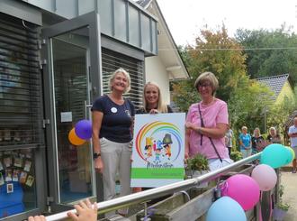 Ein besonderer Höhepunkt war die Geschenkübergabe des Fördervereins; stellvertretend für alle Mitglieder des Fördervereins überreichten Frau Remmel und Frau Michaelis den drei Leitungen ein neu gestaltetes Schild mit dem aktualisierten Kita-Logo, das künftig den Eingangsbereich schmücken wird.