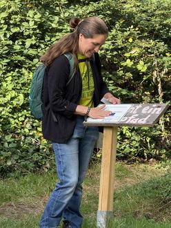 Unter der fachkundigen Leitung der Projektleiterin LuBelle Kreutzer wurden die Anwesenden entlang der insgesamt neun Stationen geführt. An jeder Haltestelle gab es kurze Einblicke in die Ideen hinter dem Entdeckerpfad sowie in die Themen, die dort erforscht werden. LuBelle Kreutzer streute dabei einige Anekdoten aus der Entstehungsphase ein, die den Prozess lebendig nachvollziehbar machten.
