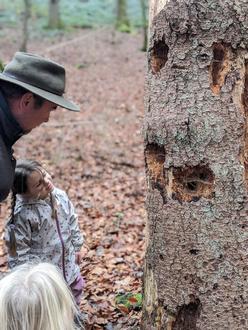 Vorbei an den Teichen und der Glitzerhöhle wollen wir dem Rundweg über den Bach folgen. Doch was ist das dort unten in dem Baum? Eine Marderhöhle, wie Herr Borries den Kindern erklärt. Er zeigt ihnen anhand von Spuren, dass diese Höhle bewohnt ist und erzählt den neugierigen Kindern wissenswertes über den Marder.