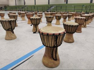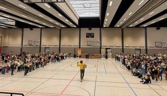 Der Höhepunkt folgte beim großen Abschluss: Gemeinsam mit weit über 100 Eltern, die ebenfalls zu Trommeln griffen, wurde das zuvor Gelernte präsentiert. Die Tribüne der Turnhalle war gut gefüllt, während die Trommelnden auf dem Hallenboden ein beeindruckendes Klangbild erzeugten. Der gemeinsame Rhythmus schuf eine besondere Atmosphäre von Zusammenhalt und Freude.