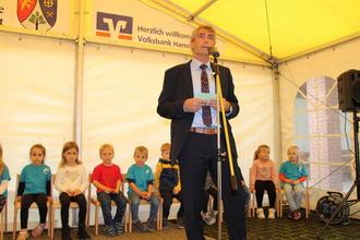 Kreisbeigeordneter Klaus Schneider sah auch Anlass für Dank an die Erzieherinnen, denn bei den beiden Liedern, die die Kindergartenkinder mit ihren Betreuerinnen zur Veranstaltung beitrugen, denn: „Man spürt, dass Sie das mit Herzblut machen!“