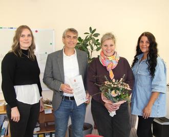 Natalie Schmidt, die in der Kita „Zauberwald“ als Erzieherin tätig ist, bekam anlässlich ihres 25-jährigen Dienstjubiläums Besuch aus der Verwaltung: Bürgermeister Dietmar Henrich, im Namen der Verbandsgemeinde als Kita-Trägerin, und Laureen Wydra, im Namen des Personalrates, beglückwünschten Natalie Schmidt zusammen mit der stellvertretenden Kita-Leiterin Lisa-Marie Petzold.
