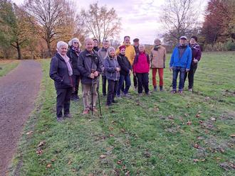 Mit dem Start am Bahnhof Breitscheidt begann am Mittwoch den 8.November 2023 um 13:45 Uhr die vorletzte Wanderung der Gruppe in diesem Jahr. Vor Beginn sorgten unsere Mitwanderer Iris und Egon Isenhardt mit einem Gläschen Prozentigen für gute Stimmung, die während der ganzen Tour anhielt. Los ging es für 14 Teilnehmer /innen leicht ansteigend durch den Wald, zu frühes Abbiegen verfehlte die eigentliche Wanderstrecke, den Westerwaldsteig an Hilgenroth vorbei. Somit ist die Wandergruppe bergab begleitet von der Laubfärbung und Bahnstrecke mit dem fahrenden HLB Zug auf einen Wirtschaftsweg gestoßen. Die anschließende herausfordernde Steigung endete am Westerwaldsteig. Ein Stück des WW entlang fiel der Blick auf Obererbach, weiter durch den Ort geht es rechts der Straße auf einem Fußweg Richtung Bhf. Obererbach. Mit Blick auf Niedererbach, nach Überquerung der Landesstrasse zu einem Privatweg. Nach kurzer Rast erfolgt der Streckenverlauf links der Bahn und rechts am Waldrand entlang. Nach einer Biegung erblicken wir die Häuser von Dieperzen. Nach weiterer Wanderung durch Dieperzen den Wald und Waldränder vorbei wird Honneroth erreicht. Honneroth war bis 1980 ein großer landwirtschaftlicher Betrieb und hieraus ist durch die Flächen ein Stadtteil von Altenkirchen mit 1600 Einwohner entstanden.