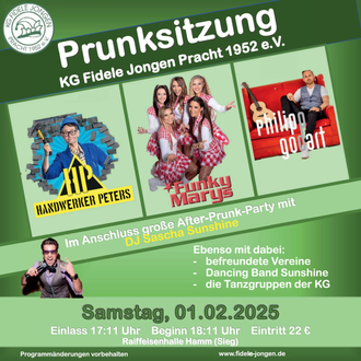 Am Samstag, 01. Februar 2025 findet ab 18.11 Uhr die Prunksitzung der KG „Fidele Jongen“ Pracht 1952 e.V. in der Raiffeisenhalle in Hamm (Sieg) statt.