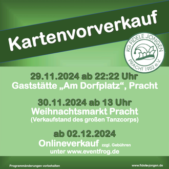 Die Eintrittskarten für Prunksitzung inklusive Party kosten 22€ und sind ab dem 29. November 2024 in der Gaststätte „Am Dorfplatz“ in Pracht erhältlich. Das Tanzcorps eröffnet am Samstag, 30. November 2024 ab 13 Uhr eine Verkaufsstelle auf dem Prachter Weihnachtmarkt.