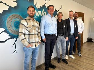 v.l.n.r. Tim Ehrlich (Wirtschaftsförderer Hamm (Sieg)), Christian Spandern (INNO FRICTION), Dietmar Henrich (Bürgermeister Verbandsgemeinde Hamm (Sieg), Frederik Fein (IHK Altenkirchen), und Stefan Löhr (INNO FRICTION).