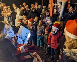 Um 17:30 Uhr kam dann der Nikolaus mit einem vollbepackten Bollerwagen. Die Kinder halfen dem Nikolaus, den schweren Wagen zum Weihnachtsbaum zu schieben. Dort angekommen las der Nikolaus eine Weihnachtsgeschichte vor, der die Kinder gespannt zuhörten.