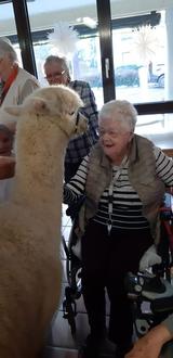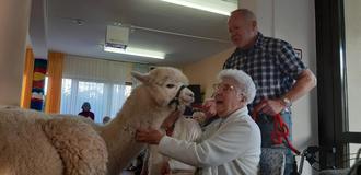 Voller Vorfreude und mit Spannung warteten die Besucher des Ev. Altenzentrums auf den angekündigten, tierischen Besuch der Alpakas. Als Herr Borrmann von der Alpakafarm „Alpakas des Westens“ mit seinen zwei Alpakas in die Einrichtung kam, war die Freude groß. Die zwei lieben und zutraulichen Tiere konnten ausgiebig gestreichelt werden und Herr Borrmann erzählte viel über diese tollen Tiere. Jeder hatte die Möglichkeit Fragen über die Alpakas zu stellen, die Herr Borrmann mit seinem Fachwissen ausführlich beantworten konnte. Die Bewohner waren ganz angetan von den niedlichen Gesichtern und der dicken und weichen Wolle. Aber nicht nur die mobilen Bewohner kamen an diesem Tag in den Genuss ein Alpaka streicheln zu können, sondern auch den Bewohnern im Zimmer wurde ein tierischer Besuch ermöglicht. Den Bewohnern konnte man die Freude durch ihr Strahlen in den Gesichtern ansehen. Alle Anwesenden waren sich einig: dieser Besuch war etwas ganz Besonderes und bedarf einer Wiederholung. Ermöglicht werden konnte dieser tierische Besuch, durch den Erlös des gemeinsamen Weinstandes am Weihnachtsmarkt vom Förderverein und den Mitarbeitern der Einrichtung.