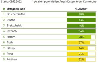 Aktuell (Stand: 09. Dezember 2022) haben 31 der 50 Kommunen im Landkreis Altenkirchen die von der Deutschen Glasfaser festgelegte Quote von 33 Prozent erreicht.