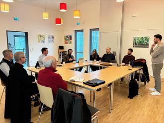 Von rechts hinten nach links vorne, um den Tisch herum: Timur Sereflioglu (zukunftsraiff.-Vorstandsmitglied, Experte für KI-Sprachassistenz), Tim Ehrlich (zukunftsraiff.-Geschäftsführer), Thomas Becker (Vertrieb GTV Luckenbach), Jeanine Müller (GTV Luckenbach), Dr. Konstatin von Niessen (Dr.-Ing., Geschäftsführung GTV Luckenbach), Christian Spandern (Geschäftsführer INNO FRICTION), Roger Orthey (Geschäftsführer TMD Friction, Standort Hamm (Sieg), zukunftsraiff.-Mitglied), Michael Weiss (Vertrieb GTV Luckenbach), Prof. Dr. Idelberger (Experte für Wirtschaftsentwicklung, Fördermitglied zukunftsraiff.).