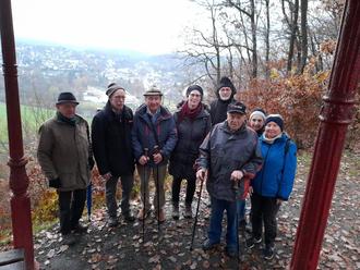 Nach ausgiebiger Besichtigung der imposanten Villa und einem Gruppenfoto führte uns der Rundweg unter der Bahn durch zur großen Wegschleife durch die parkähnlichen Sieganlagen zum Fluss und auf den Deich. Am anderen Ufer erhebt sich der ehemalige Weinberg Keltersberg. Nach dem Überqueren der Brücke führt ein 1 km langer Serpentinenweg hinauf zu einem romantischen Aussichtspavillon. Ein schöner Platz, um den malerischen Blick über das Siegtal zu genießen.