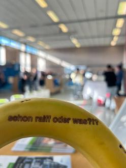 Nervennahrung und Gimmick zum Mitnehmen an den Ständen der Verbandsgemeinde und der Agentur Neumutig: die "zukunftsraiffe" Banane.