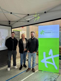 Stand der VG Hamm (Sieg), v.l.n.r.: Dennis Rötzel (Auszubildender bei der Verwaltung), Katja Manz (Kita-Sozialarbeiterin), und Tim Ehrlich (Wirtschaftsförderer der VG und zukunftsraiff.-Geschäftsführer).