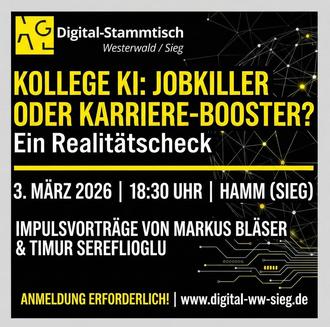 Wir freuen uns, Sie herzlich einzuladen zum nächsten Treffen des Digital-Stammtisch Westerwald/Sieg am Dienstag, 3. März 2026, 18:30 Uhr, Forum (Nebengebäude des Raiffeisenmuseums), Raiffeisenstraße 10, 57577 Hamm (Sieg), zum Thema: „Kollege KI: Jobkiller oder Karriere-Booster? Ein Realitätscheck“.