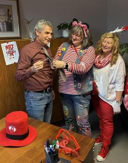 Durch die stürmische Parole und karnevalistische Hymnen bestärkt, eroberten die Frauen des Rathauses um 11.11 Uhr im Nu das Büro des Bürgermeisters, um Dietmar Henrich um die Krawatte zu erleichtern und den Rathausschlüssel zu konfiszieren. Sodann wurden Bürgermeister und Büroleiter traditionsentsprechend neu eingekleidet. Mit Accessoires in Übergröße ausgestattet, war es Zeit, mit Schlapphut und bester Sicht durch Riesenbrillen über sich hinauszuwachsen und sich unters rut-wiesse Volk zu mischen.