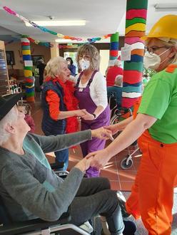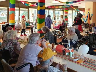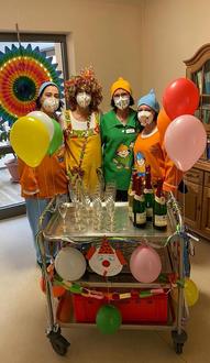 Am Rosenmontag fand dann im Altenzentrum eine Karnevalsparty für die Bewohner/innen statt. Nach einem grandiosen Auftritt der Fidelen Küken der KG Pracht konnte die Feier so richtig starten. Mit Karnevalsmusik, Sketchen und Büttenreden, Kreppelchen und dem ein oder anderen Gläschen Sekt wurde mit Bewohnern und Mitarbeitern ordentlich gefeiert, geschunkelt und getanzt.