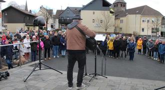 Trotz der bedrückten Stimmung wollte man Flagge zeigen, sich mit der Ukraine und den Menschen, die geflüchtet sind oder noch im Kriegsgebiet ausharren müssen, solidarisieren. Musikalischen Ausdruck verlieh diesen Gedanken Jörg Brück aus Etzbach, der Gitarre spielend mit seinen Liedern gegen Ohnmachtsgefühle und Verzweiflung ansang: „…die Felder sind zertrampelt, die Blumen, sie verdorr‘n, die Städte sind zerstört, sag, wie weit geht der Menschen Zorn?“