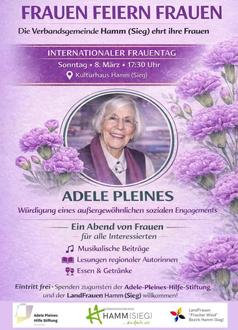 Anlässlich des Weltfrauentags laden die Verbandsgemeinde Hamm (Sieg) und die Landfrauen Frischer Wind e. V. Bezirk Hamm (Sieg) am Sonntag, 8. März, ab 17.30 Uhr ins Kulturhaus Hamm (Sieg) zu einer besonderen Abendveranstaltung ein, bei der das Leben und Wirken von Adele Pleines im Mittelpunkt steht – einer Frau, deren Engagement die Region bis heute beeinflusst.