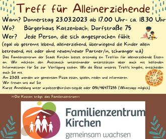 Der Alleinerziehendentreff richtet sich an Erziehungsberechtigte der Stadt & Verbandsgemeinde Kirchen. Kinder sind ausdrücklich erwünscht. Das Angebot des Familienzentrums ist für Sie kostenlos und eine Anmeldung über w.polster@kirchen-sieg.de oder 015146477255 (auch Whatsapp) möglich. Wir freuen uns auf Sie!