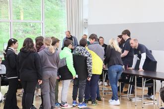 Patrick Brück trat im Bereich der “Finanzen“ mit den Schülern in Interaktion. Bei diesem Interaktionsspiel sollten die Schüler aus einem Stapel “Ausgaben“ und einem Stapel “Einnahmen“ wählen. Die “Ausgaben“ sollten hierbei die “Einnahmen“ nicht übersteigen. Bei den “Ausgaben“ gab es z.B. die Optionen Bau eines Jugendtreffs, Kreditrückzahlung oder Ausbau der Straßen. Die Grund- oder Gewerbesteuer, die Erschließungsbeiträge oder die Vermietung der Bürgerhäuser konnten als “Einnahmen“ verwendet werden. Es wurde angeregt diskutiert. Der Stapel der “Ausgaben“ war selbstverständlich etwas dicker!