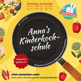 Auch dieses Jahr gibt es die Möglichkeit in Anna’s Kinderkochschule leckere und gesunde Gerichte zu kochen und einiges über die verwendeten Lebensmittel zu lernen. Wer also gerne schnibbelt, bruzzelt und nascht, wird eine Menge Spaß haben! Der erste Kinderkochkurs findet am Donnerstag, 23.05.2024 von 10 bis 13 Uhr in Freusburg im Bürgerhaus statt. Der zweite Kurs folgt am gleichen Tag am gleichen Ort von 15 bis 18 Uhr. Kinder und Jugendliche ab 7 Jahren sind herzlich eingeladen teilzunehmen. Hier betragen die Kursgebühren 5 €.