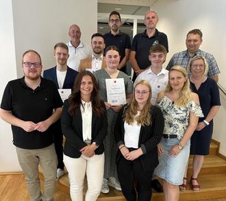 Bei der VG Kirchen gab es anlässlich von Ernennungen, Beförderungen und bestandenen Prüfungen Grund zu feiern. Auf dem Foto: 1. Reihe von links: Bürgermeister Andreas Hundhausen, Teresa Muhl, Michelle Josie Kringe, Ausbildungsleiterin Swetlana Neufeld. 2. Reihe von links: Maximilian Müller, Auszubildende Alana Sofie Schaefer, Auszubildender Mario Bender, Petra Urigshardt (Leiterin Fachgebiet 1.1 und stv. Leiterin Fachbereich 1 Zentrale Dienste) Hintere Reihe von links: Bernd Schmidt (Leiter Fachbereich 3 Bürgerdienste), Ben-Simon Gotthardt, Tim Kraft (Leiter Fachbereich 5 Kommunalentwicklung), Peter Mockenhaupt (Personalrat), Büroleiter Michael Dützer.