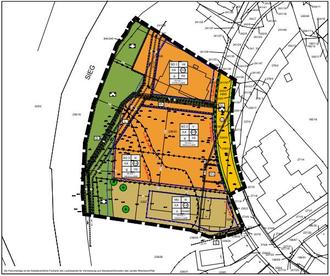 Momentan befinden sich innerhalb des ca. 1,3 ha großen Plangebiet eine große Parkplatzfläche, die dem DRK-Klinikum dient und drei Gebäude. Bei einem der Gebäude handelt es sich um eine leerstehende Heizzentrale, die zurückgebaut werden soll. Im Westen und Süden ist das Plangebiet durch eine parkartige Grünanlage mit Rasenflächen, Einzelbäumen und dem bewachsenen Uferrandstreifen der Sieg geprägt.