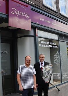 Bürgermeister Andreas Hundhausen gratulierte Philipp Zapatka zur Eröffnung der neuen Zweigstelle in der Stadt Kirchen. Das Bestattungsunternehmen ist ein familiengeführter Betrieb in zweiter Generation und existiert seit 1983, gegründet von Ulrich und Rita Zapatka. Seit 2018 trägt Philipp Zapatka mit seinen beiden Schwestern und dem Mitarbeiter-Team die Philosophie des Unternehmens weiter. Neben dem Hauptsitz in Mudersbach hat das Unternehmen in der Verbandsgemeinde Kirchen die Nebenfiliale in Brachbach und seit dem 01.05.24 die Filiale in Kirchen.