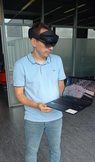 Fachbereichsleiter Tim Kraft testet die Stadt- und Gemeindeplanung mittels VR/AR-Brille und digitalem 3-D-Modell.