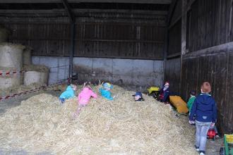 Auf dem weitläufigen Hof des Forstbetriebs wurde für die Kinder eine spannende Stationsrallye zum Thema Hof vorbereitet. Hier konnten die Kinder an verschiedenen Stationen ihre Geschicklichkeit und ihre Bewegungsfreudigkeit unter Beweis stellen. Ein besonderes Highlight für die Kinder war die Heubaustelle, die in einem der Ställe aufgebaut war. Dabei konnten die Kinder mit kleinen Baggern spielen und sich im Heu austoben.