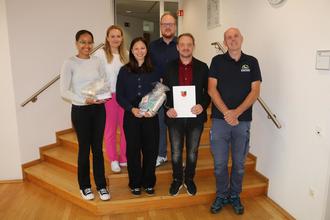 Leticia Ngyombo (links) und Jenny Reichel (3. von links) haben ihre Ausbildung im Kirchener Rathaus begonnen. Bürgermeister Andreas Hundhausen (3. von rechts), Ausbildungsleiterin Swetlana Neufeld und Peter Mockenhaupt (rechts) vom Personalrat wünschten einen guten Start ins Berufsleben. Glückwünsche gab es auch für Sebastian Lippert (2. von rechts) anlässlich seines „silbernen“ Dienstjubiläums