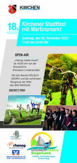 Vom Rathaus- bis zum Bahnhofsplatz verwandelt sich Kirchen (Sieg) am 05. November 2023, 11 bis 22 Uhr, zum 18. Kirchener Stadtfest mit Martinsmarkt, Ausstellungen, Nonston-Bühnenprogramm, Tag der offenen Tür und Int. Wandertag wieder in eine große Festmeile.