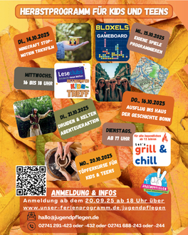 Ebenfalls am Dienstag, 14. und 21. Oktober, jeweils ab 17 Uhr, lädt das „Grill’n’Chill“ alle Jugendlichen ab 12 Jahren zum entspannten Ferientreff in den Betzdorfer Jugendtreff ein. Hier gilt: einfach vorbeikommen, Freunde mitbringen, Spaß haben – kostenlos und ohne Anmeldung.