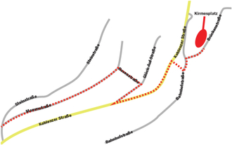 Aufstellung des Zuges ist um 13.45 Uhr in der Mommstraße im Bereich der Hausnummern 35-49. Der Abmarsch von dort erfolgt um 14.30 Uhr bis zur Rosenstraße, über die Konrad-Adenauer-Straße, Koblenzer Straße (B 62) in die Bahnhofstraße bis zum Festzelt auf dem Kirmesplatz.