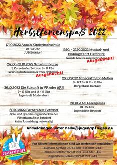 Auch in diesen Herbstferien gibt es wieder ein buntes Programm, um keine Langweile aufkommen zu lassen! Anmeldungen zu den Veranstaltungen nehmen wir unter hallo@jugendpflegen.de entgegen!