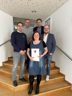 Andrea Höfer erhielt im Kirchener Rathaus ihre Ernennungsurkunde anlässlich ihrer Beförderung. Es gratulierten (von links): Fachbereichsleiter Tim Kraft, Personalratsvorsitzender Alexander Grindel, Büroleiter Michael Dützer, Bürgermeister Andreas Hundhausen