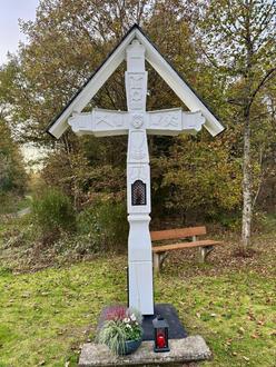 Die engagierte Gruppe von Restauratoren besorgte neue, massive Eichenbalken mit den beeindruckenden Maßen von 30 x 30 cm und begann mit viel handwerklichem Geschick die zeitintensive Arbeit: Sägen, Schnitzen und Schleifen, bis das Ginkekreuz in traditionellem weißen Anstrich am 27. September 2024 in alter Pracht mit einer stattlichen Höhe von 3,30 Meter an seinem Platz aufgestellt werden konnte.