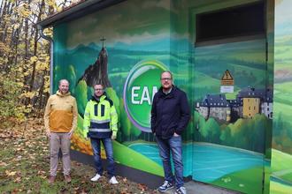Die EAM hat die Trafostation "Siegstraße" in diesem Jahr saniert und dabei das Dach und die Fassade erneuert. Um die Fassade vor der Witterung zu schützen, wurde sie mit einer speziellen Folie versehen. "Der Einsatz der Folie hat uns auf die Idee gebracht, die Station zusätzlich zur Sanierung auch optisch ansprechend zu gestalten", sagt Johannes Rudolph, Leiter der EAM Netzregion Altenkirchen. "Uns war wichtig, bei der Gestaltung regionale Motive, wie den Druidenstein und die Freusburg aufzugreifen, aber auch erneuerbare Energien darzustellen, die zu unseren Kerngeschäften gehören", ergänzt Steffen Schiebe, der zusammen mit Denniver Oppermann das Projekt von Seiten EAM betreut hat.