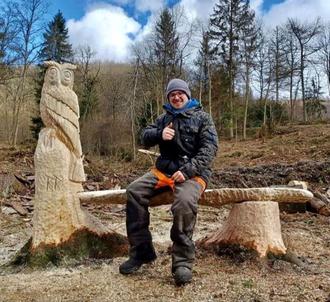 16:00 bis 17:00 Uhr Live-Schnitz-Act des Holz- und Kettensägenkünstlers Robin Rosenthal aus Niederfischbach vor der Sparkasse