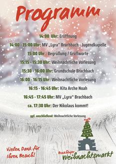 Während der Heimatverein extra für den Weihnachtsmarkt den Backes einheizt und neben Hefezöpfe erstmals Zimtschnecken verkauft, sorgen die SG Mudersbach/Brachbach für Nachschub an Kaltgetränken und die Vereinsmitglieder des Radsportclubs „Schachtspäddchen“ für den Ausschank von echtem Winzer-Glühwein. Der Förderverein der Grundschule bietet Apfelpunsch, heißen Kakao und Schokofrüchte am Spieß an. Jedes Jahr beliebt und schon am frühen Abend ausverkauft sind die heißen Cocktails von Simone Schäfer, denn ihren „Braschbijer Engel“ gibt´s immer nur exklusiv am Brachbacher Weihnachtsmarkt.