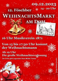 Am Samstag, den 09. Dezember 2023 stimmt man sich auf Weihnachten ein, beim zwölften Föschber Weihnachtsmarkt rund um den Siegerländer Dom. In Absprache mit Bürgermeister Dominik Schuh sowie dem Organisation Team des Fördervereins Haus Mutter Teresa vertreten durch Klaus-Jürgen Griese und Rainer Kessler wird der Weihnachtsmarkt auf der Domplatte des Siegerländer Dom von 14:00 Uhr – 20:00 Uhr stattfinden.