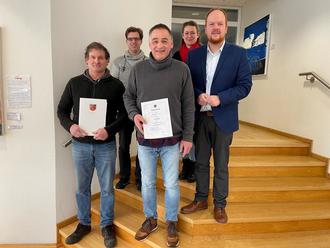 Michael Stark (vorne links) und Stefan Strunk wurden für 25 Jahre im öffentlichen Dienst geehrt. Es gratulieren (von rechts): Bürgermeister Andreas Hundhausen, Riccarda Vitt vom Personalrat und Marco Hörter (Leiter VG Werke). Nicht auf dem Bild ist Beate Pfeiffer, die ihr 40. Dienstjubiläum feiert.
