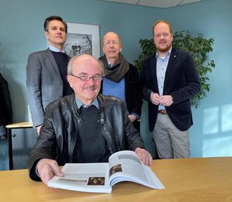 Dr. Thomas Bartolosch (vorne) stellte sein neues Sachbuch im Kirchener Rathaus vor. Über die Publikation freuten sich die Jung-Nachfahren Oliver Schneider und Stephan Hintze sowie Bürgermeister Andreas Hundhausen (von links).